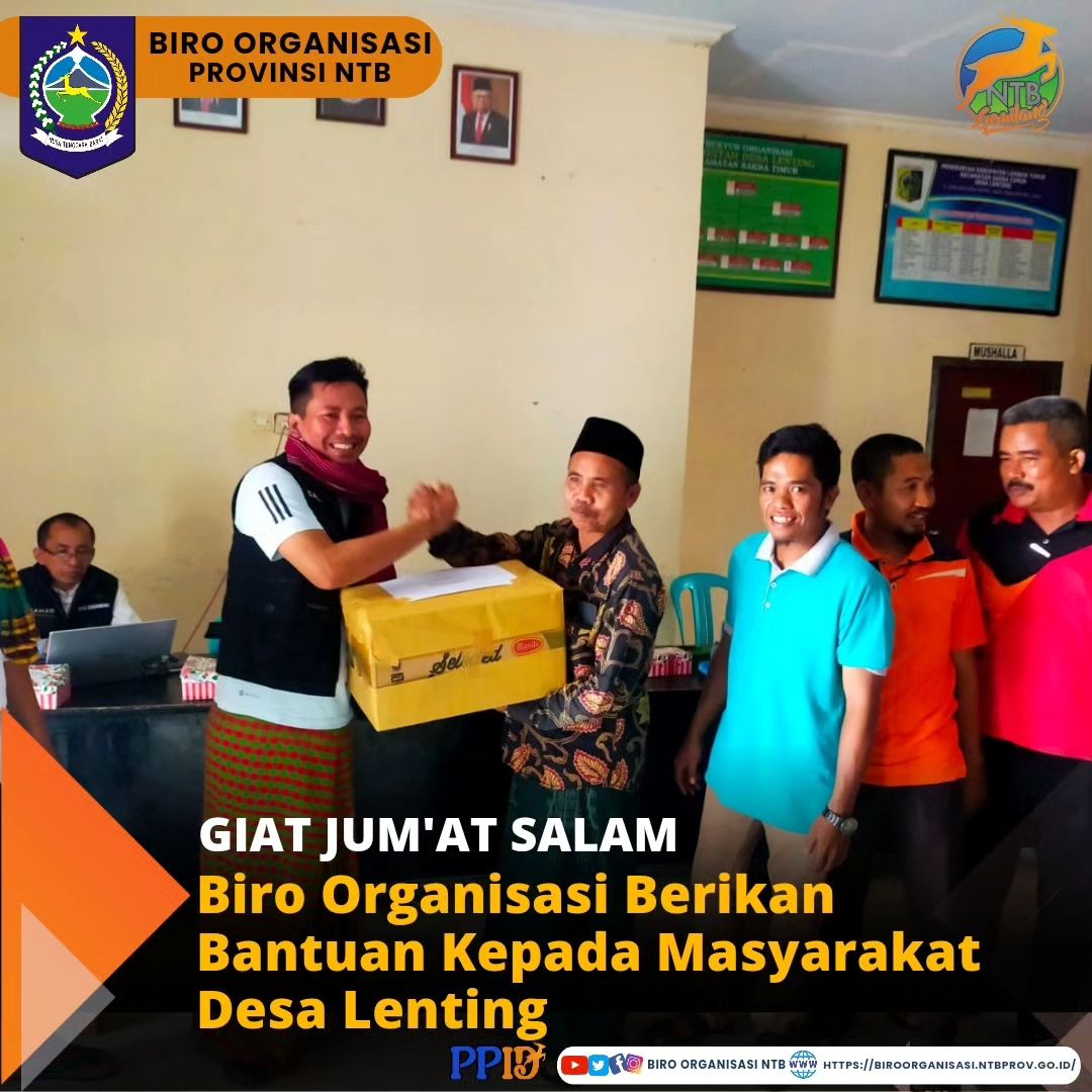 Jum'at, 10/11/2023 - Sebagai rangkaian dari kegiatan pendampingan Desa Lenting dalam Gerakan JUM'AT SALAM, Kepala Biro Organisasi, Dr. Nursalim, S.Sos., MM., didampingi Kepala Bagian RB AKIP dan Kepala Bagian Kelembagaan ANJAB bersama Biro PBJ Setda Provinsi NTB memberikan secara langsung bantuan kepada masyarakat Desa Lenting, yang diterima Tokoh Agama Desa Lenting.Bantuan yang diberikan berupa pakaian yang sangat layak pakai dan buku bacaan untuk meningkatkan minat baca anak dan masyarakat Desa Lenting.#BiroOrganisasiNTB #jumatsalam #NTBmajumelaju