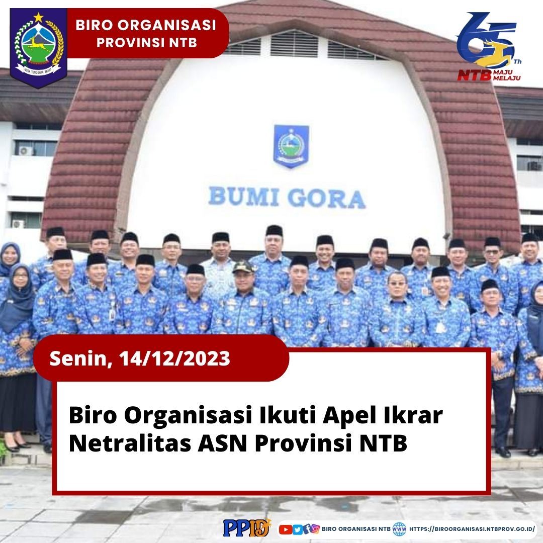 Senin, 04/12/2023 - Kepala Biro Organisasi Setda Provinsi NTB, Dr. Nursalim, S.Sos.,MM. dan semua ASN Biro Organisasi Setda Provinsi NTB mengikuti Apel Ikrar Netralitas ASN di Lapangan Bumi Gora Kantor Gubernur NTB.