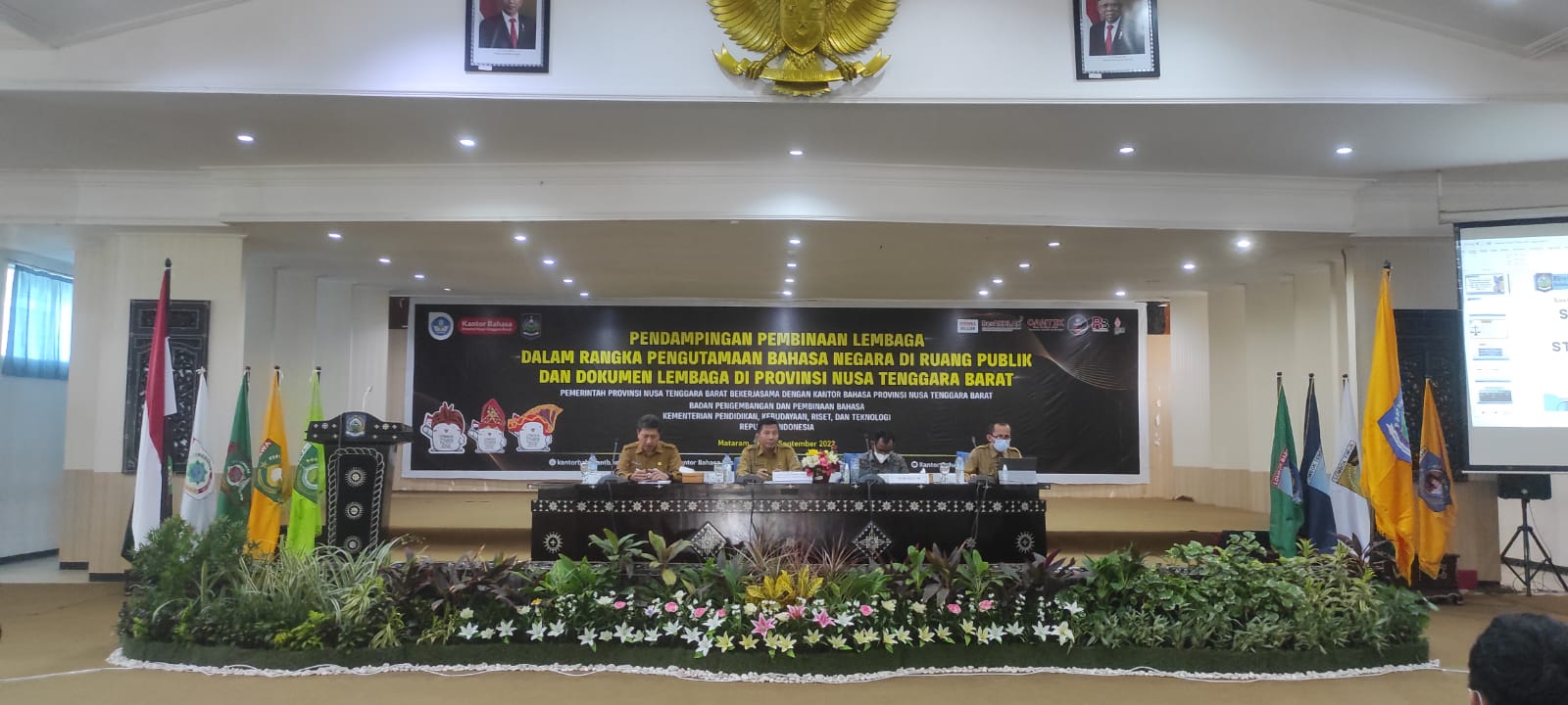 Biro Organisasi Setda NTB bersama Kantor Bahasa Provinsi NTB lakukan pendampingan Pembinaan Lembaga terkait Tata Naskah Dinas dan Sistem Kerja Kegiatan Pendampingan Pembinaan Lembaga Dalam Rangka Pengutamaan Bahasa Negara di Ruang Publik dan Dokumen Lembaga di Provinsi Nusa Tenggara Barat berlangsung selama 3 hari mulai dari 26 - 28 September 2022. Sementara untuk pembukaan akan dilaksanakan tanggal Selasa, 27 September 2022. Kegiatan hari ini diawali materi dari narasumber dan Kata Sambutan dari Kordinator Tata Usaha Kantor Bahasa Provinsi NTB Kasman, M.Hum pada pukul 08.30 WITA di Graha Bakti Praja, Senin (26/09/2022). Kegiatan Materi pertama disampaikan Kepala Biro Organisasi Setda NTB Dr.Nursalim, mengenai Sistem Kerja pasca penyederhanaan Struktur Organisasi dan Penyetaraan Jabatan Berdasarkan Peraturan Gubernur Nusa Tenggara Barat Nomor 72 Tahun 2022. "Pergub No 72 Thn 2022 merupakan penjabaran dari PermenpanRB no 25 thn 2021, PermenpanRB no 17 Thn 2021 serta PermenpanRB no 7 Thn 2022" Ucap Kepala Biro Organisasi Dalam kesempatan tersebut turut disampaikan mengenai materi sistem kerja, mekanisme kerja, kedudukan serta penilaian dari koordinator, sub koordinator dan pelaksana, hingga penghasilan dan pengelolaan keuangan yang diatur pada Pergub No 72 Tahun 2022. Materi kedua disampaikan oleh Kepala Dinas Perpustakaan dan Kearsipan Provinsi NTB Drs.Tri Budiprayitno,M.Si mengenai Tata Naskah Dinas dan Aplikasi Srikandi. Kegiatan berlangsung secara interaktif dengan adanya sesi diskusi antara Pemateri dan Peserta yang mengikuti Kegiatan Pendampingan. Selanjutnya materi disampaikan dari Kantor Bahasa mengenai Pembinaan Bahasa Indonesia dalam Tata Naskah Dinas oleh Bapak Wawan Prihartono dan Ejaan dalam Tata Naskah Dinas dan Papan Informasi Publik oleh Bapak Kasman,. M.Hum dan Zamzam Hariro,.M.Pd. Pada Kesempatan tersebut turut hadir Seluruh Organisasi Perangkat Daerah Provinsi, Kabupaten/Kota di Nusa Tenggara Barat Demikian...(Biro Organisasi Official)