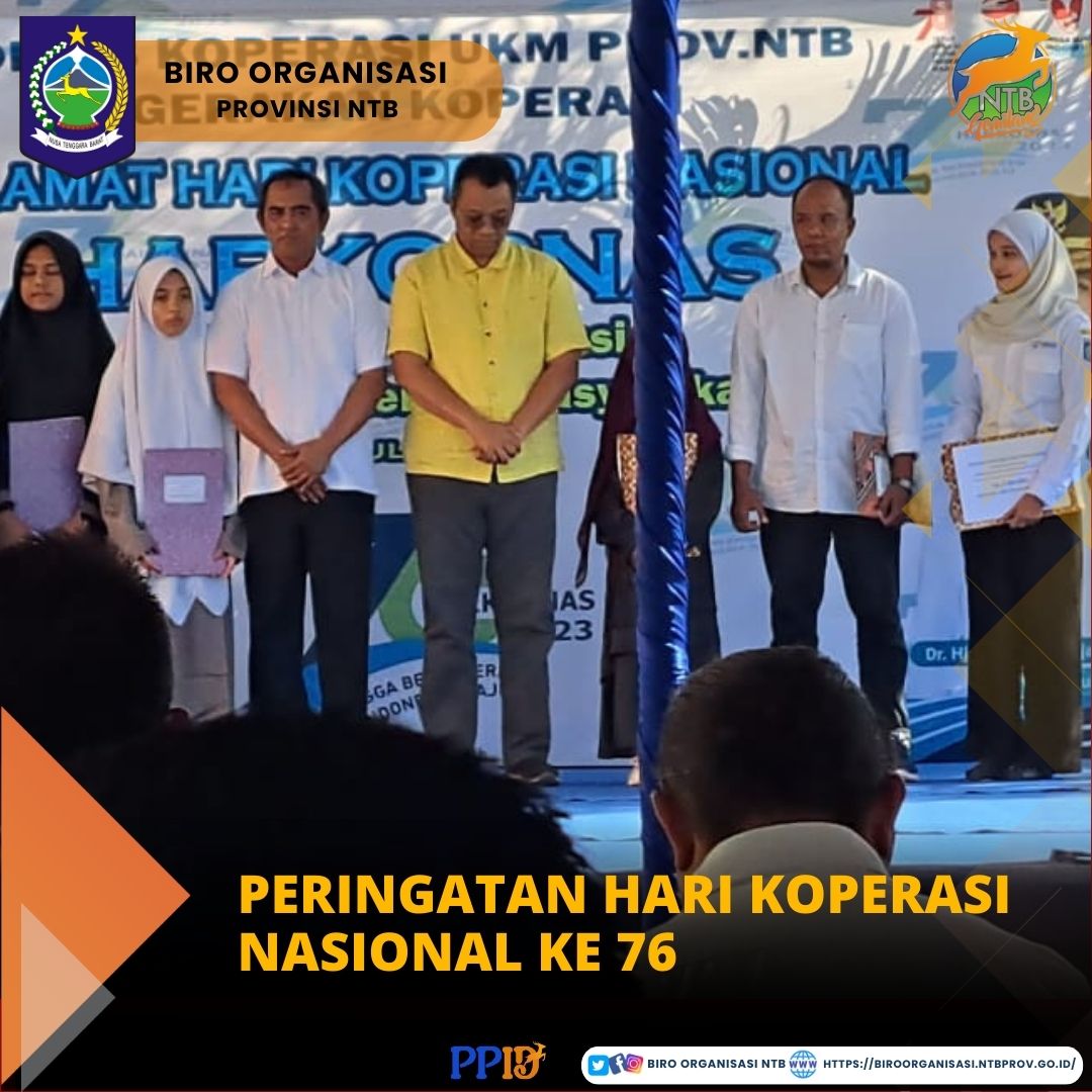 Rabu, 12/07/2023 - Mewakili Kepala Biro Organisasi Setda Provinsi NTB, Dr. Nursalim, S.Sos. MM. Kepala Bagian Tatalaksa, Ahlul Wakti, ST. MUM. menghadiri acara Tasyakuran Peringatan Hari Koperasi Nasional yang ke 76 dengan Tema "Pemajuan Koperasi, Kunci Kesejahteraan Masyarakat" di Dinas Koperasi UKM Provinsi NTB, yang dihadiri langsung oleh Bapak Gubernur NTB, Dr. H. Zulkieflimansyah, SE, M.Sc. dan para Kepala OPD lingkup Pemerintah Provinsi NTB.