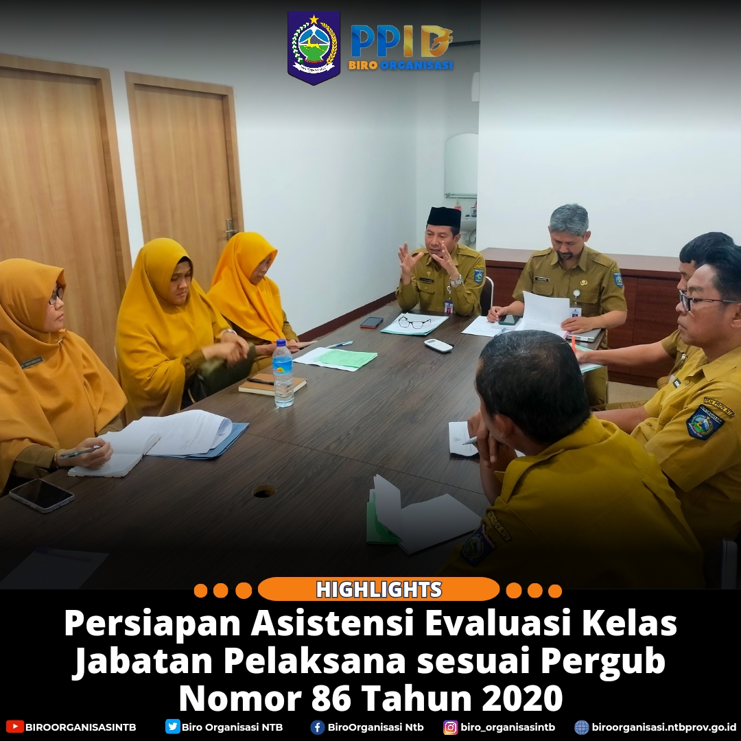 Senin, 11/11/2024 - Sesuai Peraturan Gubernur Nomor 86 Tahun 2020 tentang Kelas Jabatan Pimpinan Tinggi, Administrator, Pengawasan, Pelaksana dan Fungsional di Lingkungan Pemerintah Provinsi NTB, Biro Organisasi bersama Biro Hukum, Perangkat Daerah dari BKD, BPKAD, BAPPEDA, BAPENDA dan Inspektorat Provinsi NTB melakukan Rapat Koordinasi mengenai mekanisme dan output pelaksanaan asistensi evaluasi penerapan Peraturan Gubernur Nomor 86 Tahun 2020, khususnya mengenai Jabatan Pelaksana.