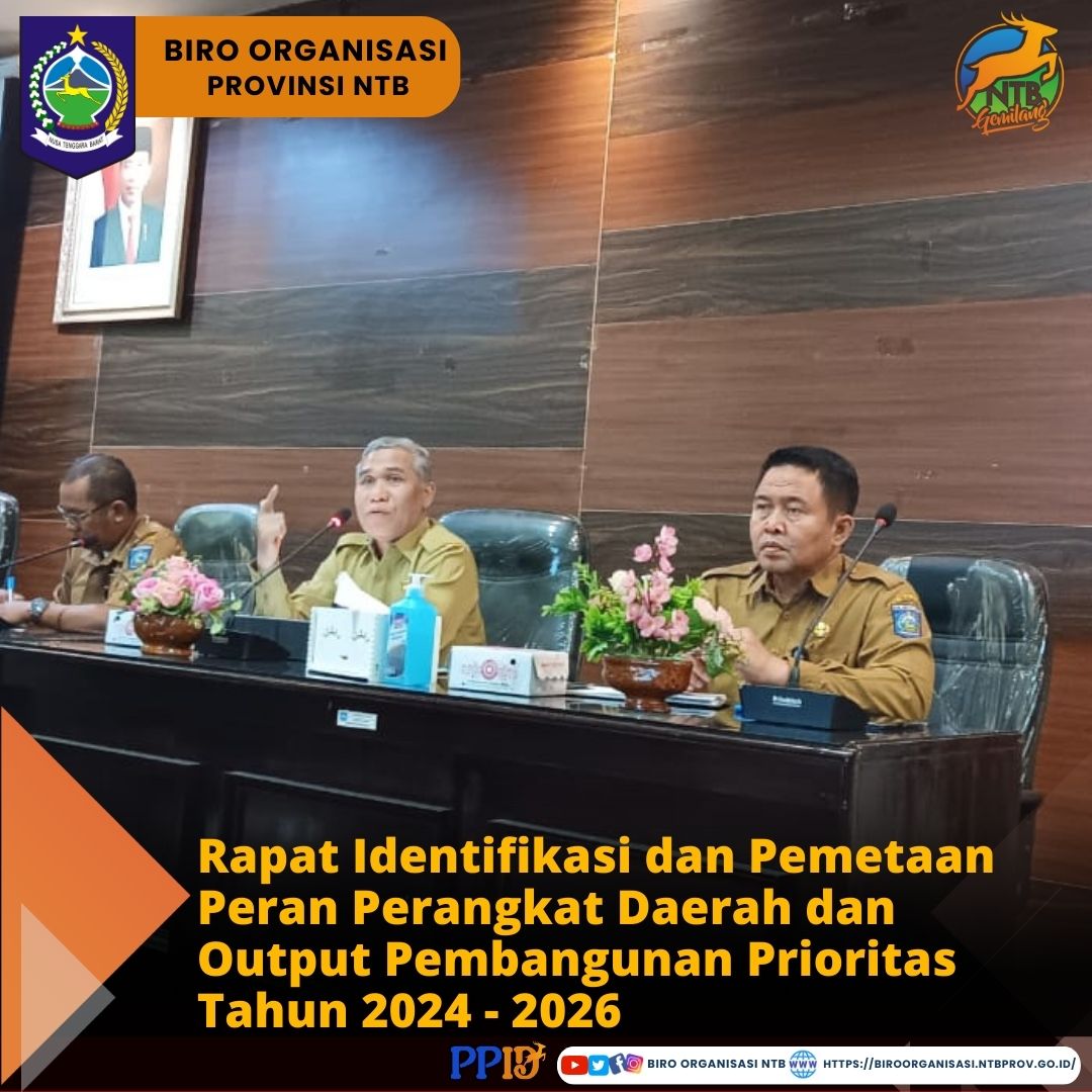 Senin, 04/09/2023 - Mewakili Kepala Biro Organisasi Setda Provinsi NT, Dr. Nursalim, S.Sos.,MM., Kasubbag TU, Nedi Goli,SH., dan Penyusun Program Anggaran dan Pelaporan Sumartha Hadi Yara, S.Adm menghadiri Rapat Identifikasi dan Pemetaan Peran OPD dalam Pencapaian Agenda dan Out Put Pembangunan Prioritas RPD Tahun 2024-2026 di Ruang Rapat BAPPEDA Provinsi NTB.