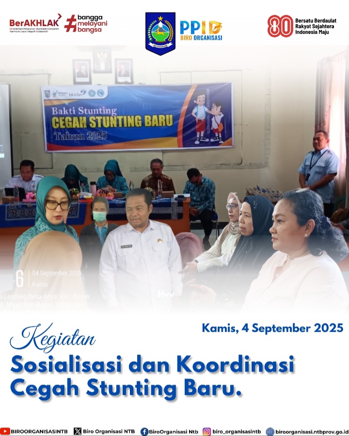 Biro Organisasi - Mewakili Kepala Biro Organisasi Kepala Sub Bagian Tata Usaha Nedi Goli,SH. Analis kebijakan ahli muda Sundari Setyawati,S.Sos. Penelaah Teknis Kebijakan Ramlie dan Penelaah Teknis Kebijakan Fatmawati,SH. Menghadiri acara koordinasi dan sosialisasi teknis kegiatan pencegahan stunting, yang diselenggaran oleh Dinas Kesehatan Provinsi NTB melalui gerakan pencegahan stunting baru dengan pemberian protein hewani pada lokus desa berdaya, bertempat di kantor camat bayan kabupaten lombok utara (4/9/2025).