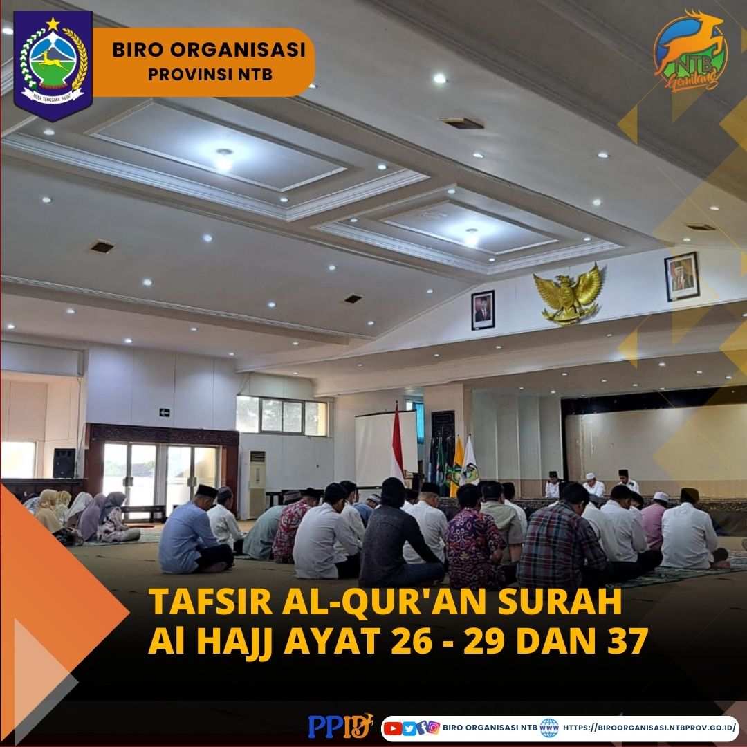 Jumat, 07/07/2023 - Biro Organisasi Setda Provinsi NTB mengikuti kegiatan Imtaq Jum'at Lingkup Pemerintah Provinsi Nusa Tenggara Barat di Gedung Graha Bhakti Praja Kantor Gubernur NTB dengan Tema, Tafsir Al Qur'an Surah Al Hajj Ayat 26 - 29 dan 37 yang disampaikan oleh TGH. Taesir Al Azhar, MA.