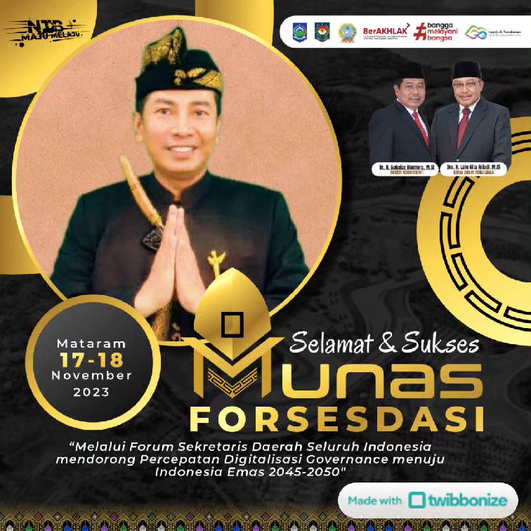 Musyawarah Nasional (MUNAS) Forum Sekretaris Daerah Seluruh Indonesia (FORSESDASI) Pada 17 - 18 November di Hotel Lombok Raya Mataram, Nusa Tenggara Barat."Melalui Forum Sekretaris Daerah Seluruh Indonesia mendorong Percepatan Digitalisasi Governance menuju Indonesia Emas 2045-2050"Yuk Ramaikan! dengan menggunakan Twibbon dibawah ini :