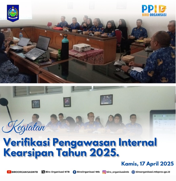 Kamis, 17/04/2025 Mewakili Kepala Biro Organisasi Plt.Kepala Bagian TataLaksana Sundari Setyawati,S.Sos. bersama Kasubag Tata Usaha Nedi Goli,SH. dan Ramlie Penelaah Teknis Kebijakan menghadiri Rapat Pengawasan Kearsipan Internal bertempat di Ruang Rapat Dinas Perpustakaan dan Kearsipan Provinsi NTB. Adapun tujuan untuk mengevaluasi tata kelola arsip apakah sesuai peraturan perundang- undangan yang berlaku dan untuk mempermudah saat membutuhkan arsip, pendampingan sebelum dilakukan audit/evaluasi arsip oleh Tim Pengawas Kearsipan Provinsi NTB.