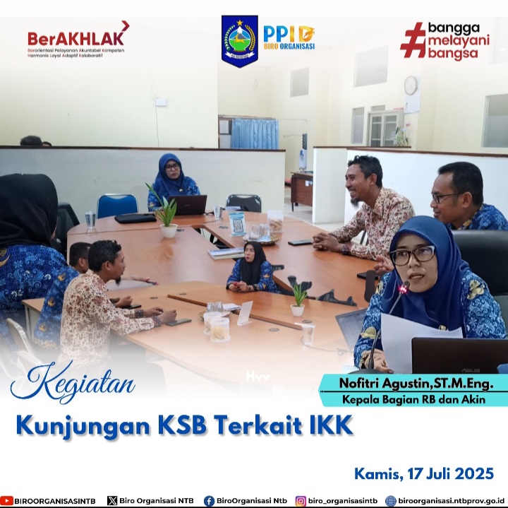 Konsultasi terkait Indeks Kualitas Kebijakan (IKK), karena di KSB IKK dilimpahkan ke Bagian Organisasi sedangkan di Pemerintah Provinsi NTB IKK menjadi Tugas dan Fungsi Biro Hukum. Penyusunan IKK melibatkan JF Analis Kebijakan di Perangkat Daerah yang dikomandoi oleh Biro Hukum sebagai Person in Charge (PIC) Lembaga Administrasi Negara (LAN).